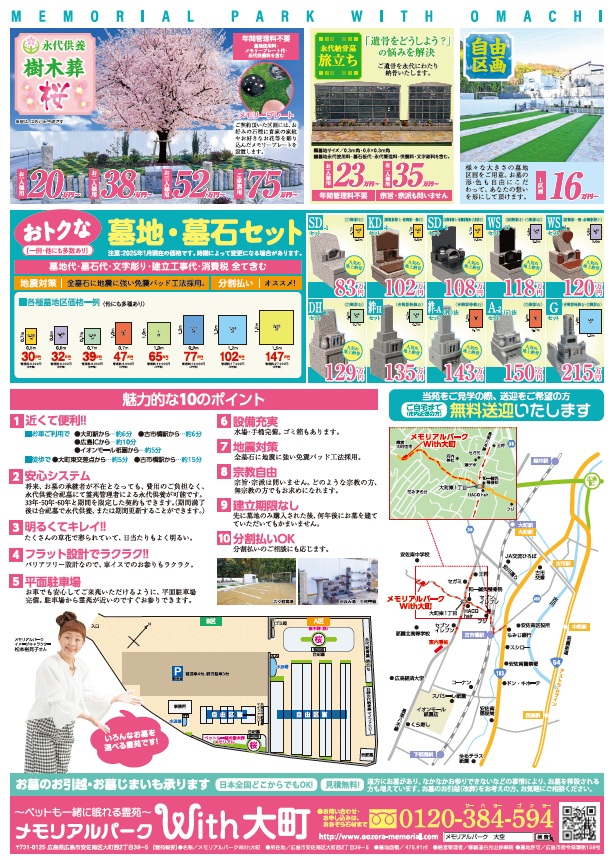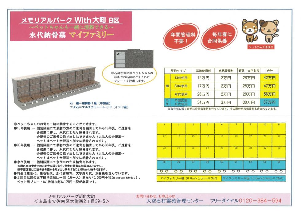 2024年12月に広島市安佐南区に「オープンした「メモリアルパーク With 大町」は、一般墓所をはじめ樹木葬などの永代供養墓がいろいろ選べる霊園です。 ペットちゃんと一緒のお墓もあります。